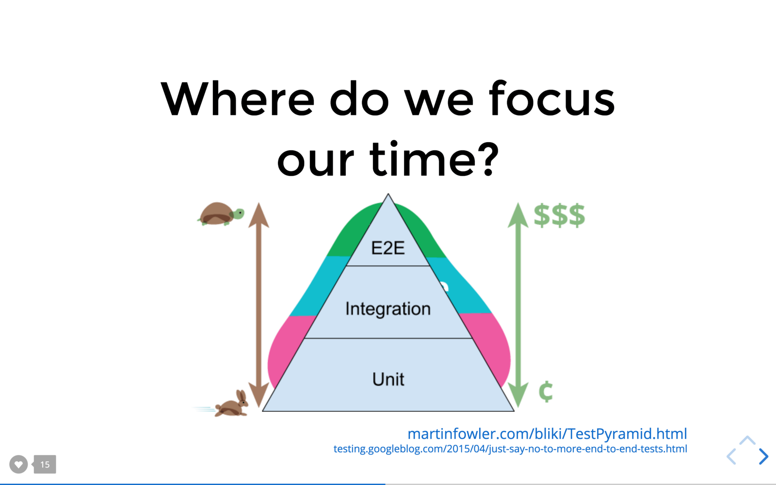 피라미드의 위로 올라갈수록 테스트를 실행하고 작성하는데 더 많은 시간이 들고, 실행하고 유지보수하는데 비용(시간과 자원 측면에서)이 많이 듭니다. 그림만 보면 유닛 테스트를 작성하는데 시간을 더 투자해야 하는 것 처럼 보입니다.