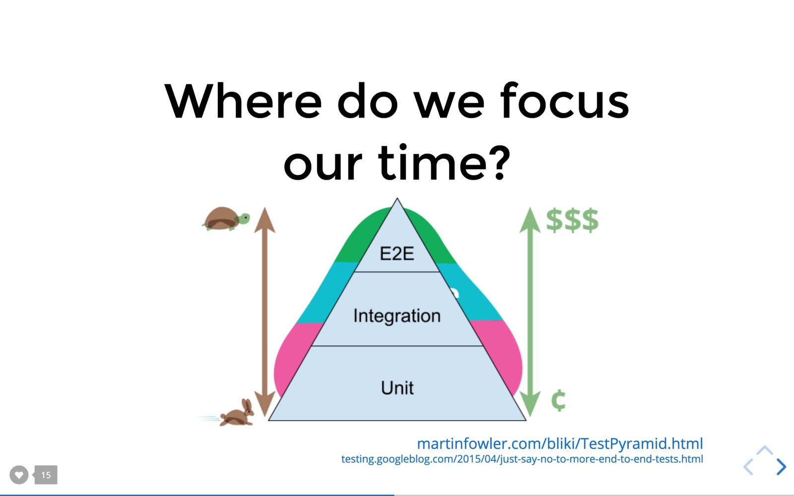 통합 테스트는 자신감을 심어주는 역할 대비 속도/비용을 부담하는 정도를 아주 균형있게 가지고 있습니다. 그래서 여러분이 대부분(혹시 몰라 말씀드리지만 전부는 아닙니다)의 시간을 통합 테스트에 투자하라는 조언을 드리는 겁니다.